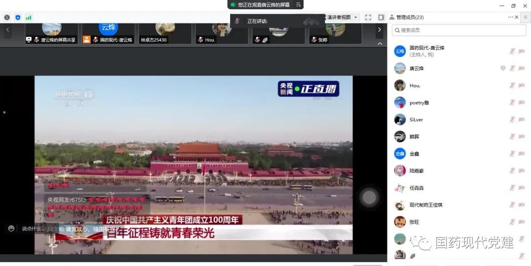 2022年5月10日上午,按照国药尊龙凯时中国区人生就是博党委部署,国药尊龙凯时中国区人生就是博团委组织全级次团员青年集中在线上观看了庆祝中国共产主义青年团成立100周年大会,进一步增强公司广大团员青年政治思想引领,鼓励青年听党话、跟党走,号召团员青年以实际行动“喜迎二十大、永远跟党走、奋进新征程”!国药尊龙凯时中国区人生就是博党委副书记、纪委书记、工会主席余向东和团员青年们一同观看了大会直播。