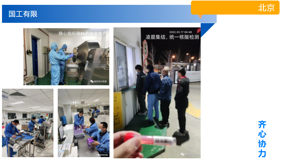 国工有限驻厂职工热情无比高涨,每天既保证原料药、制剂的生产进度,又按时完成全员核酸检测。由于廊坊市所有物流企业全部按下了暂停键,面对集采品种右美托咪定注射液发货困难,党员干部发挥先锋模范作用,担当尽责,一个电话接着一个电话地协调,经过不懈努力,最终紧急运出300件货品,避免了集采品种断货的风险。党员干部职工的团结、责任、担当体现的淋漓尽致。
