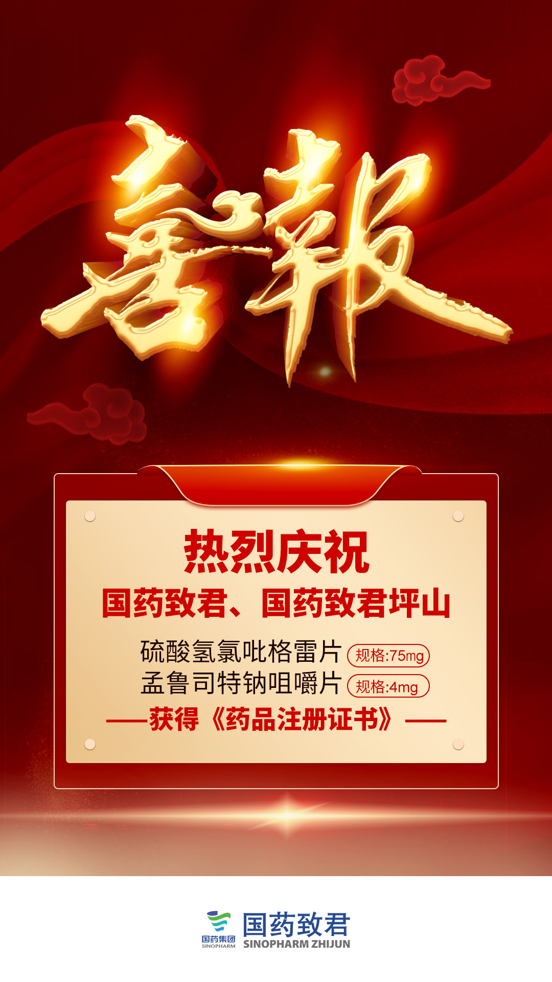 近日,国药致君、国药致君坪山分别收到国家药品监督管理局核准签发的《药品注册证书》,批准硫酸氢氯吡格雷片(75mg)、孟鲁司特钠咀嚼片(4mg)通过注册,两个产品均以化学药品注册分类4类获批上市,并视同通过仿制药质量和疗效—致性评价。
