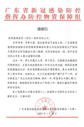 国药金石收到广东省新冠感染防控物资保障组感谢信